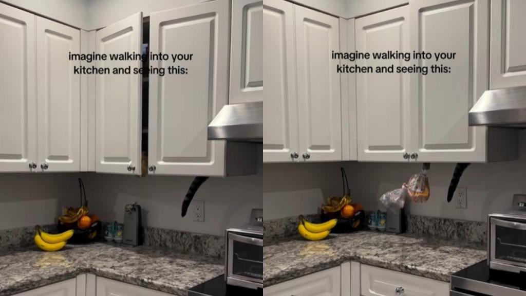 The video’s onscreen caption reads, “Imagine walking into your kitchen and seeing this,” and the scene plays out with the cat in the middle of his theft inside a kitchen cabinet. After the cabinet shuts, a packet of bread suddenly slips out, hangs for a second, then drops to the counter. Loki stays inside the cabinet, committed to finishing whatever mission he started.