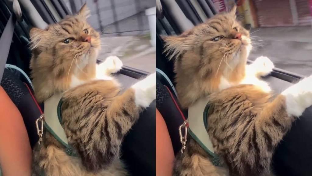 The owner explains in the onscreen text, “Every time the window opens he becomes the main character,” while another line adds, “Wind in his face, ears flying, zero worries.” And that’s exactly what it looks like. In the video, Mr. Puss squints into the fresh air with the calmness of a saint — except he is a cat who is probably living his best life during the car ride.
