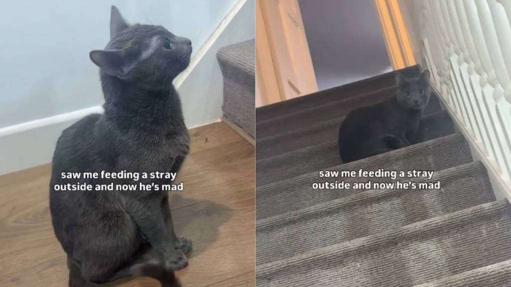Kosmo’s mom thought her secret snack session with the neighborhood stray was private, but her Russian Blue witnessed the whole betrayal. The video from @kosmothetalkingcat shows the cat sitting near the stairs like any other day. But when his mom reaches out to touch him, he pulls away with a sharp flick of his ears.