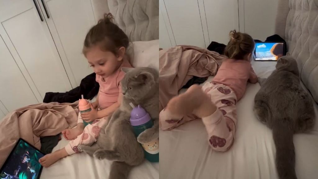 A video shared by @polina.laren on Instagram captures a calm and wholesome scene between a young child and her feline companion. The toddler is seen lying comfortably on a bed, with an iPad that is playing what appears to be an animated movie. Right beside her, the family cat mirrors her posture, stretched out in almost the same relaxed position.